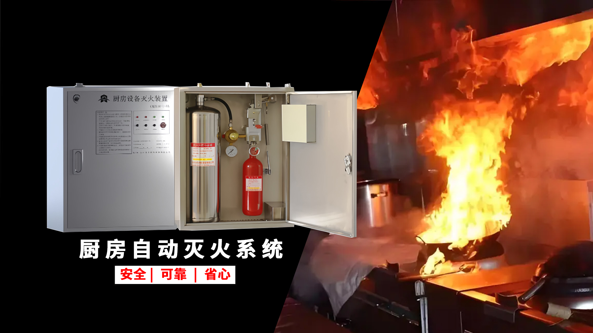 廚房設(shè)備滅火裝置,固定安裝于廚房等高濕熱環(huán)境中,由滅火劑瓶組(鋼瓶、虹吸管滅火劑)、聯(lián)動閥、管路(滅火劑施放管路、冷卻管路)、噴嘴(專用霧化噴嘴)、閥門(液體單向閥和水流閥)、火災(zāi)探測部件(易熔金屬感溫器)、控制盤等組成的能自動探測并實施滅火的箱式滅火裝置。